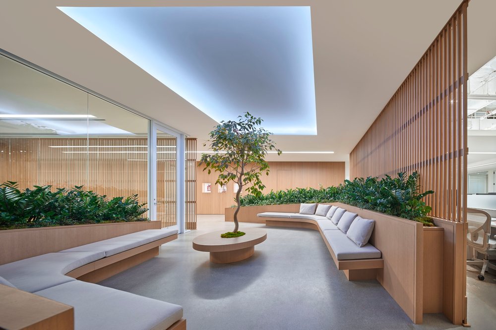 Showcased here is one of the firm’s best projects. Spanning over 40,000 square feet, this project is the creative offices for a well-known cosmetics and skin care company in Santa Monica. The Standard team drew inspiration from the brand’s first brick and mortar retail store. The slatted oak screens are an effective space divider for the serene reception area.